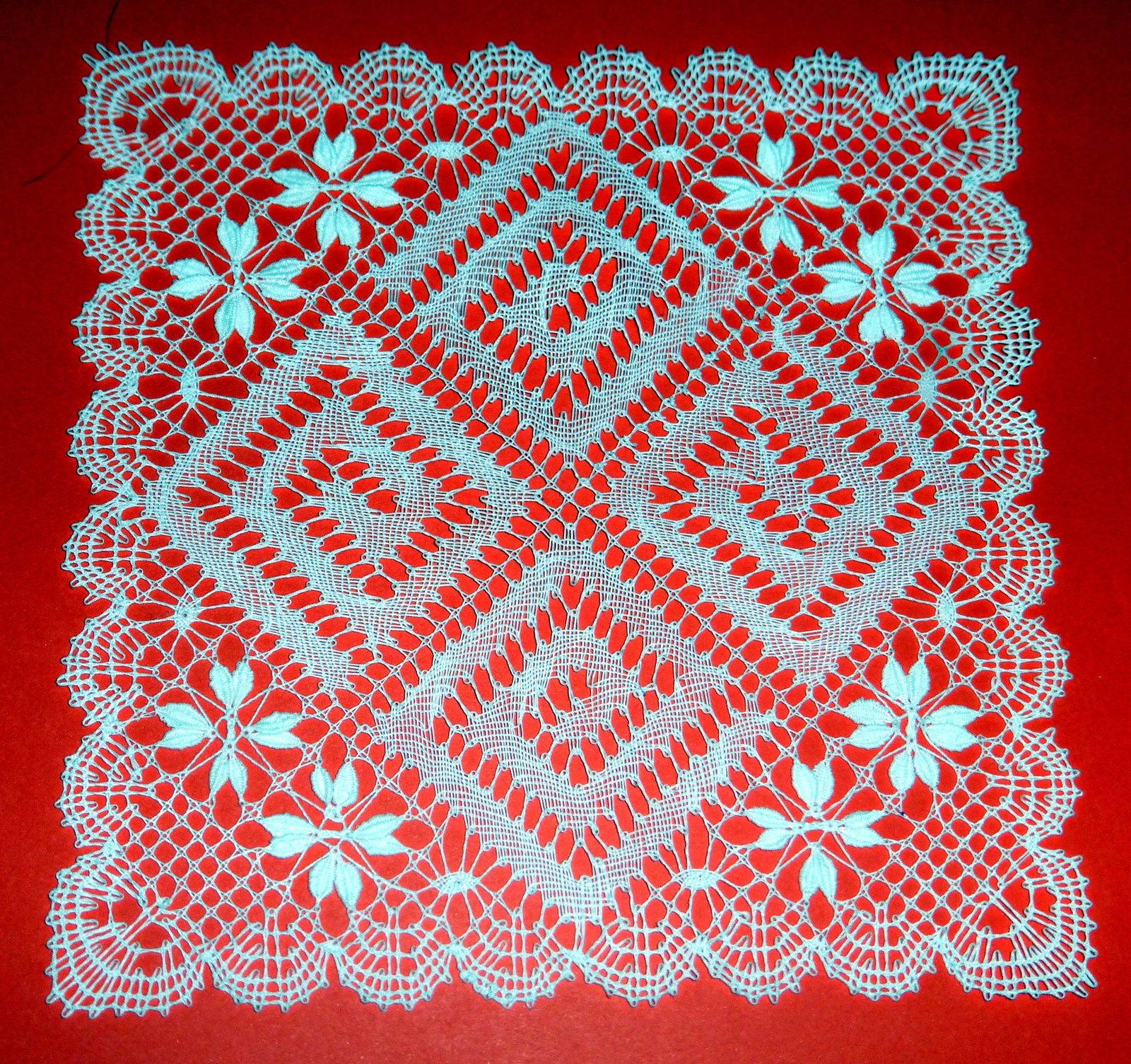 Bravo à Maryvonne V. pour ce magnifique napperon qui ressort bien sur fond rouge.